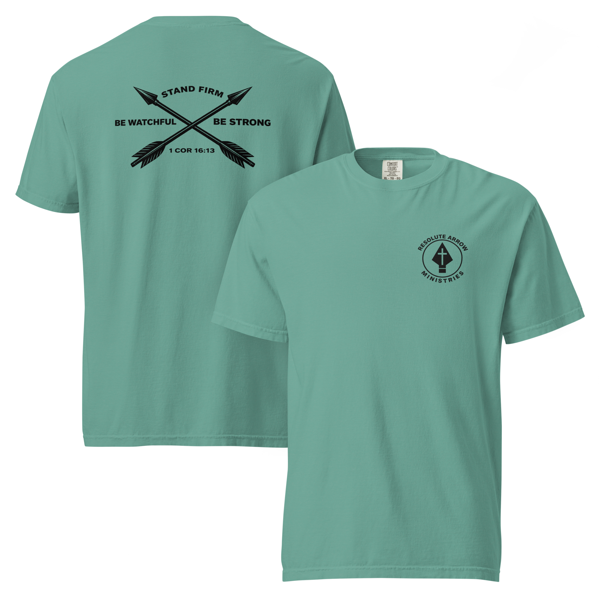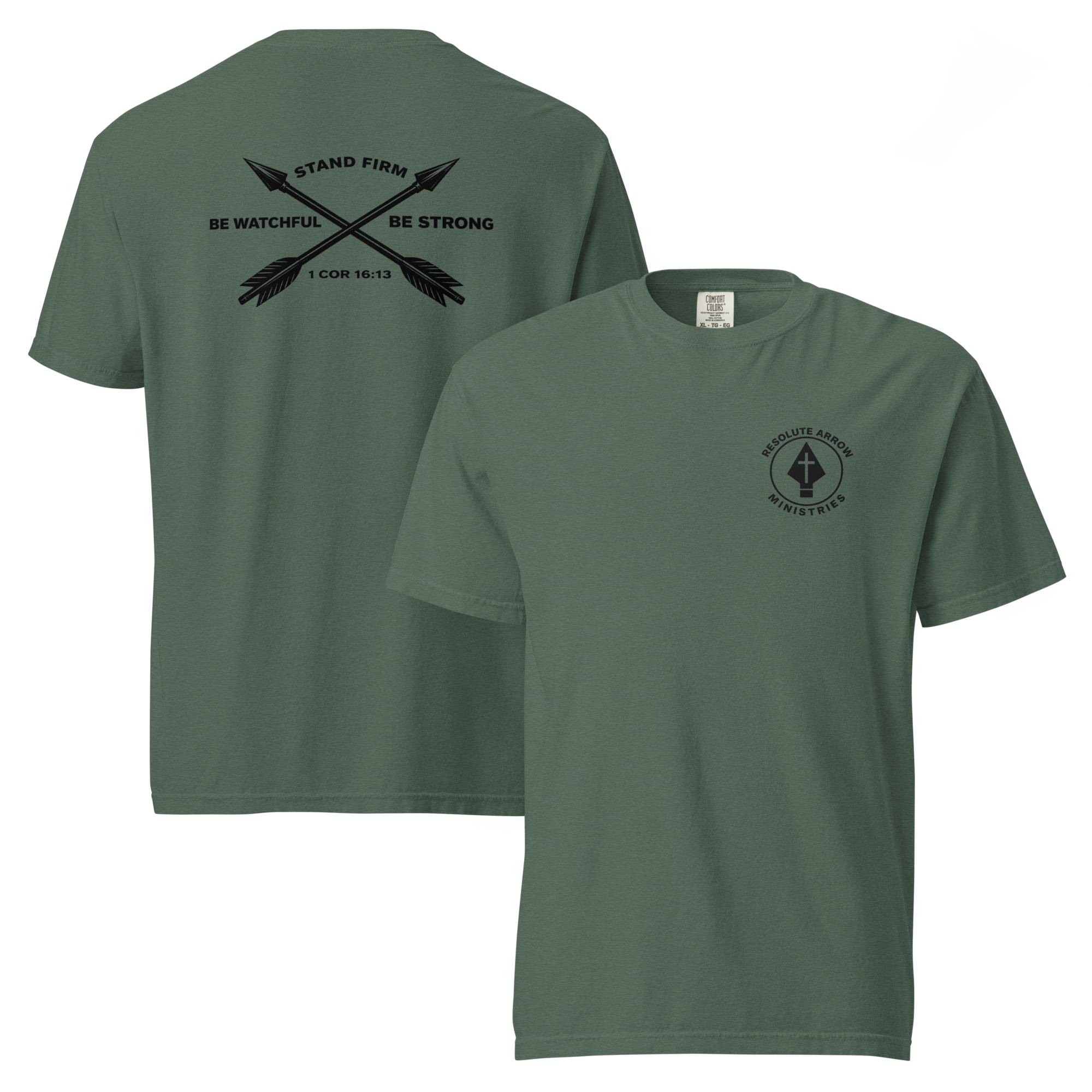 Built with purpose. Designed to stand firm. Featuring a crossed-arrows design inspired by 1 Corinthians 16:13, a call to be watchful, stand firm in the faith, and be strong. Clean, balanced, and unmistakably resolute, this piece is made for those who carry conviction into everyday life. Crafted from garment-dyed cotton, it delivers a structured feel with long-lasting comfort. The heavyweight fabric provides durability and a consistent, reliable wear.